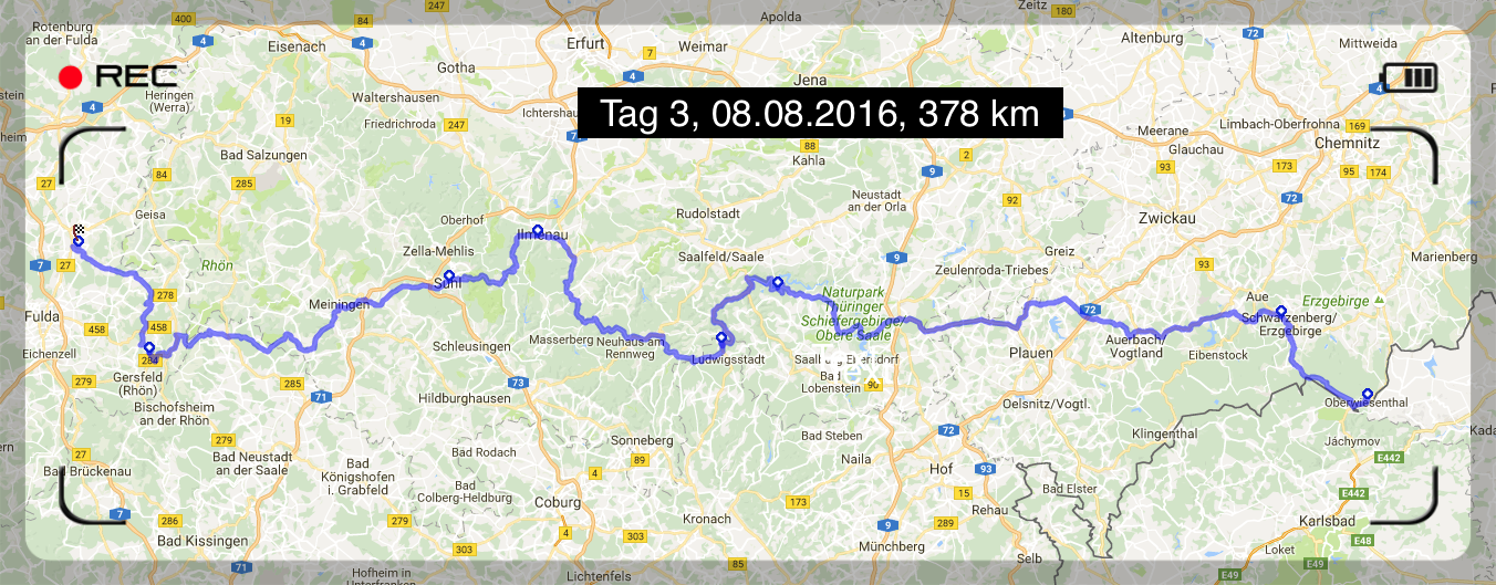 Am dritten Tag wurde ich durch ein nicht zu übertreffendes Frühstücksbuffett für 3,70 € überrascht. Im tiefen Osten bekommt man offenbar noch was für den hart erarbeiteten Euro 😀. Nachdem das Motorrad wieder startklar war, fuhr ich direkt auf den höchsten Berg des Erzgebirges, den Fichtelberg (1214 Meter über NHN). Dort wurde ich mit einem großartigen Ausblick und einer tollen Morgensonne verwöhnt. Und dann begann das große Umleitungschaos. Offenbar gibt es in Sachsen den Beruf des staatlich geprüften Umleitungsgestalters. In zwei Fällen führte mich eine Umleitung (Sperrung aufgrund von Bauarbeiten) am Ende in eine totale Sackgasse. In einem anderen Fall habe ich dann eine Vollsperrung mal „übersehen“. Es stellte sich dann heraus, dass die Baumfällarbeiten schon abgeschlossen waren und ich hab nicht einen Arbeiter auf der gesperrten Straße gesehen. Die „Umleitung“ hätte mich nochmals über 30 km gekostet. Insgesamt habe ich durch diese Aktionen statt der geplanten 1281 km tatsächlich 1426 km absolviert, also 145 km für „Umleitungen“. Am Ende des Tages ging es noch hoch auf die Wasserkuppe und dann zum Etappenziel nach Hünfeld. Dort durfte ich einen sehr netten Abend mit lieben Verwandten verbringen.